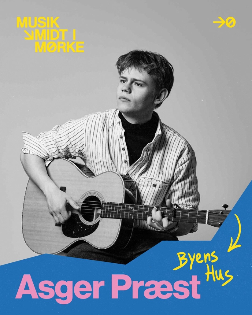 Asger Præst (Byens Hus)20:30Asger Præst er en folk-rock sangskriver, der spiller original sange på både Dansk ogEngelsk! Sangene bevæger sig i et krydsfelt mellem Folk, Rock og Blues, men fælles foralle sangene er Asgers unikke guitarspil, og hans personlige stemme!De Danske sange har ofte tekster der kommentere på udkants Danmark, og de oversete stemmer rundt om i landet, ofte med en lille historie som introduktion, mens de Engelske oftest har melodien i fokus. Dog altid med velovervejet lyrik!Asger Præst optræder både med band og som soloartist! Asger Præst kan opleves somsoloartist til musik midt i Mørke.