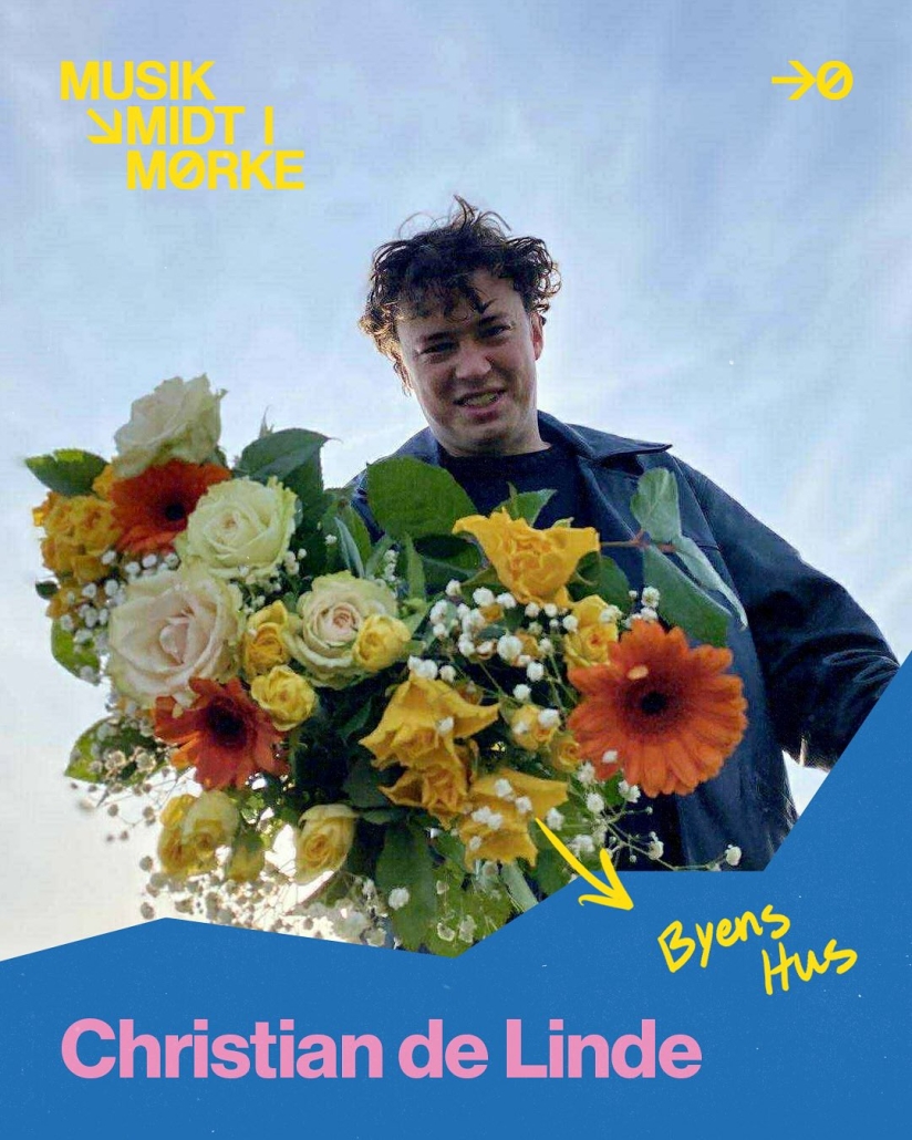 Christian De Linde (Byens Hus)17.30Christian er en popmusiker fra Aarhus, der efter otte måneder i Livgarden nu vender tilbage til scenen. Koncerten i Mørke bliver hans første i lang tid, og han har bandet med sig.Publikum kan se frem til både sange, der allerede er udgivet, og helt nye numre, som får deres debut denne aften.